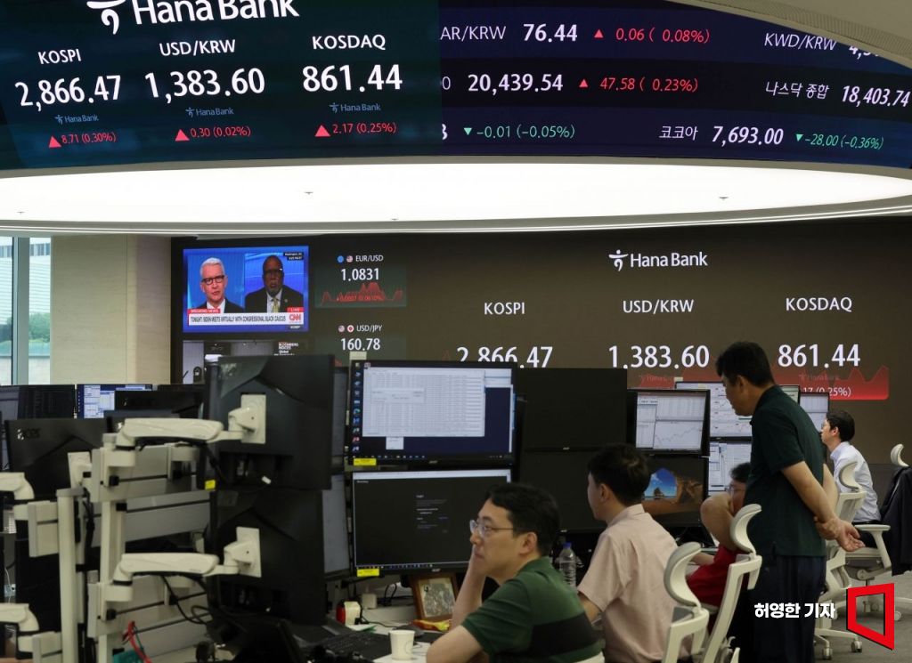 연일 연고치를 경신하던 코스피가 전일 하락 전환했지만 9일 코스피는 재차 상승 출발하며 주중 2900선 돌파 여부가 주목된다. 서울 하나은행 본점 딜링룸에서 직원들이 업무를 보고 있다.