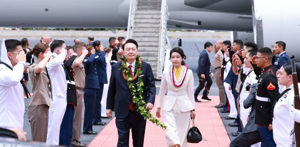 윤 대통령과 부인 김건희 여사는 이날 오후 호놀룰루 히캄 공군기지에 도착했다. 윤 대통령과 김 여사가 전용기인 공군 1호기에서 내리자 미국 측에서는 조시 그린 하와이 주지사 부부, 사무엘 파파로 미 인도태평양 사령관 부부, 골든버그 주한미국대사, 라캐머라 주한미군 사령관이 나와 윤 대통령 부부를 맞았다. 미국 육군·해군·공군 군복을 입은 군인 20여명이 도열해 거수경례로 윤 대통령 부부를 환영했다.