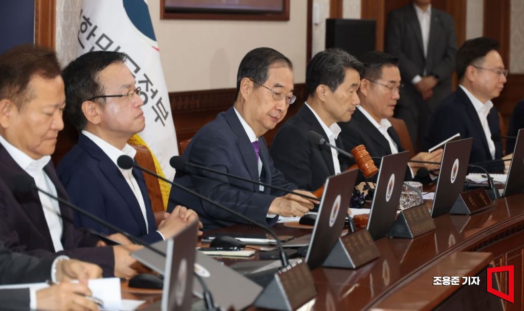 한덕수 국무총리가 9일 서울 종로구 정부서울청사에서 열린 국무회의에 참석해 회의 개회 의사봉을 두드리고 있다. 이날 회의에선 ‘채 상병 특검법’에 대한 재의요구권(거부권)을 의결할 예정이다. 사진=조용준 기자 jun21@