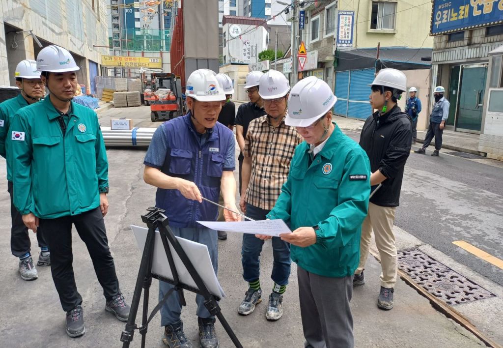 김용학 부산도시공사 사장이 대형공사 현장을 직접 방문해 안전관리 실태를 점검하고 있다.