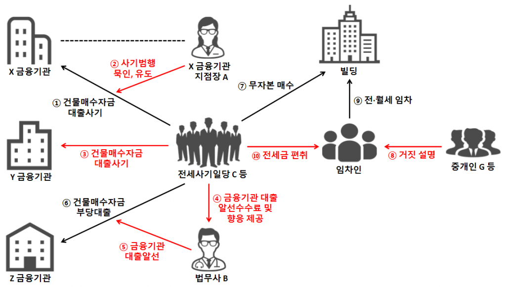 전세사기 일당과 이들에게 협조한 현직 금융기관 지점장, 법무사, 공인중개사 등이 무더기로 법정에 서게 됐다.