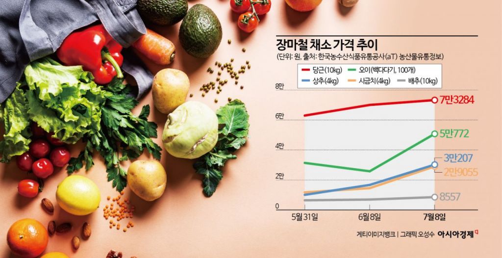 문제는 채소가격 오름세가 향후 지속될 수 있다는 점이다. aT는 주요 채소 가격 전망과 관련 "향후에도 장마의 영향으로 산지 작업물량이 감소할 것으로 예상된다"며 "생육 부진과 생산량 감소로 강보합세가 전망된다"고 말했다.