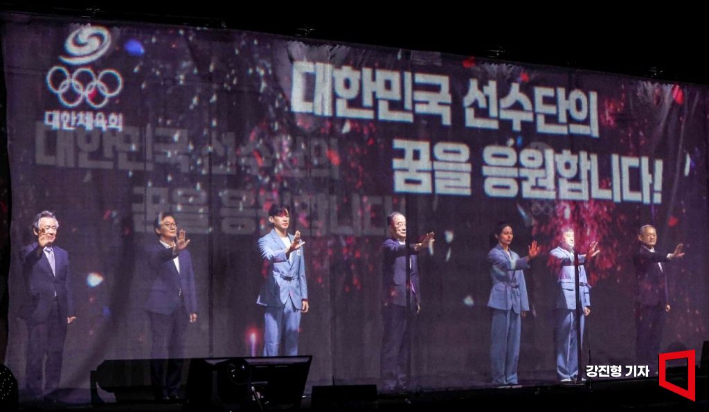 한덕수 국무총리가 9일 서울 송파구 올림픽공원에서 열린 '파리올림픽 선수단 결단식' 에서 유인촌 문화체육관광부 장관, 이기흥 대한체육회장 및 참가선수단과 함께 선전 기원 세리머니를 하고 있다.