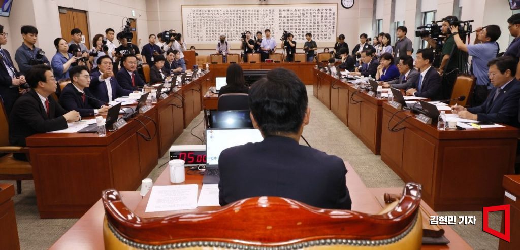 9일 국회에서 열린 법제사법위원회 전체회의에서 여당 의원들이 정청래 위원장의 의사진행에 항의하고 있다. 사진=김현민 기자 kimhyun81@