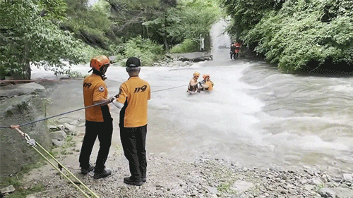 소방대원들이 불어난 계곡물을 가로지르며 요구조자를 구조해 나오고 있다. [사진제공=경남소방본부]