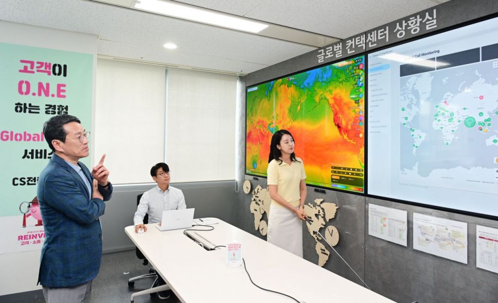 이와 함께 50여 개 해외법인 산하 60여 개 상담센터 운영 지표를 실시간으로 관리하는 글로벌 상담센터 통합 상황실도 점검했다. 그중에서 글로벌 고객의 불편 사항을 빠르게 파악해 대응하는 '호크아이' 활용 현황을 꼼꼼히 확인했다. 호크아이는 상담 데이터나 온라인 트렌드를 모니터링, 선제적으로 고객 페인포인트를 찾고 개선하는 시스템이다. AI 상담 인프라를 이용해 언어와 지역, 시간의 경계 없는 24시간 다국어 응대 시스템 구축도 살폈다. LG전자는 유럽 지역에서 통합 챗봇을 운영하며 중장기 무인상담률을 50%까지 늘릴 계획이다.