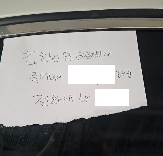 A씨는 "민폐 주차를 해서 화가 난 입주민이 차에 침을 뱉은 모양이다"라며 "'차량에 침을 뱉으면 죽여버리겠다'는 식의 쪽지를 앞 유리판에 붙여놨다"고 상황을 설명했다. 쪽지에는 '침 한 번만 더 뱉어봐라. 죽어버리게. X(남성의 성기를 뜻하는 은어) 같으면 전화해라'라고 적혀있다. 이어 A씨는 "112에 신고를 했고, 퇴근하고 (해당 차량이 아직까지도 주차되어 있는지) 확인해보려고 한다"라며 "주차를 이상하게 하는 것도 열 받는데, 살인 예고로 안 잡혀가나 모르겠다"고 말했다.