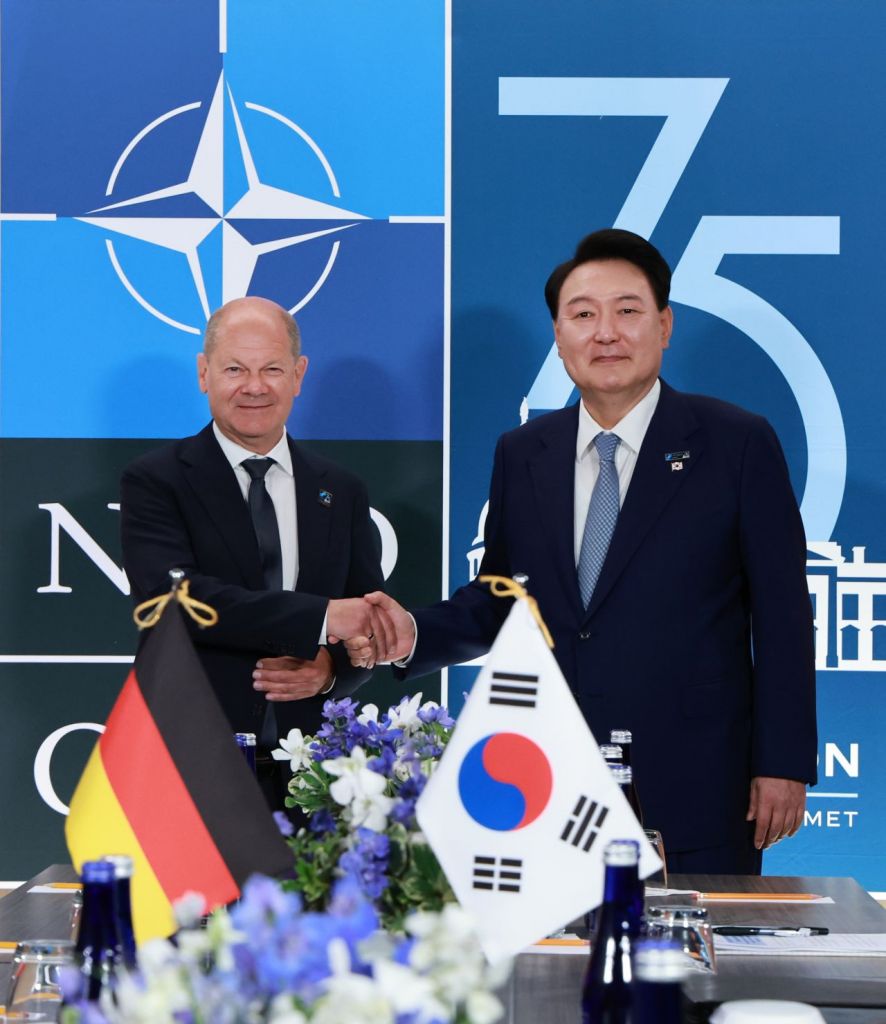 윤석열 대통령이 10일(현지시간) 북대서양조약기구(NATO·나토) 75주년 정상회의가 개최된 미국 워싱턴DC 월터 E. 워싱턴 컨벤션센터에서 열린 한-독일 정상회담에서 올라프 숄츠 독일 총리와 악수하고 있다. [이미지출처=연합뉴스]
