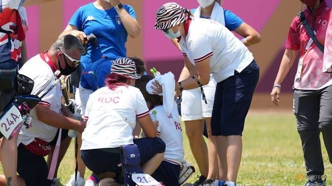 2021년 유메노시마공원에서 열린 도쿄올림픽 양궁경기장에서 러시아 선수 스베틀라나 곰보에바(23)가 폭염에 실신한 모습(자료=연합뉴스)