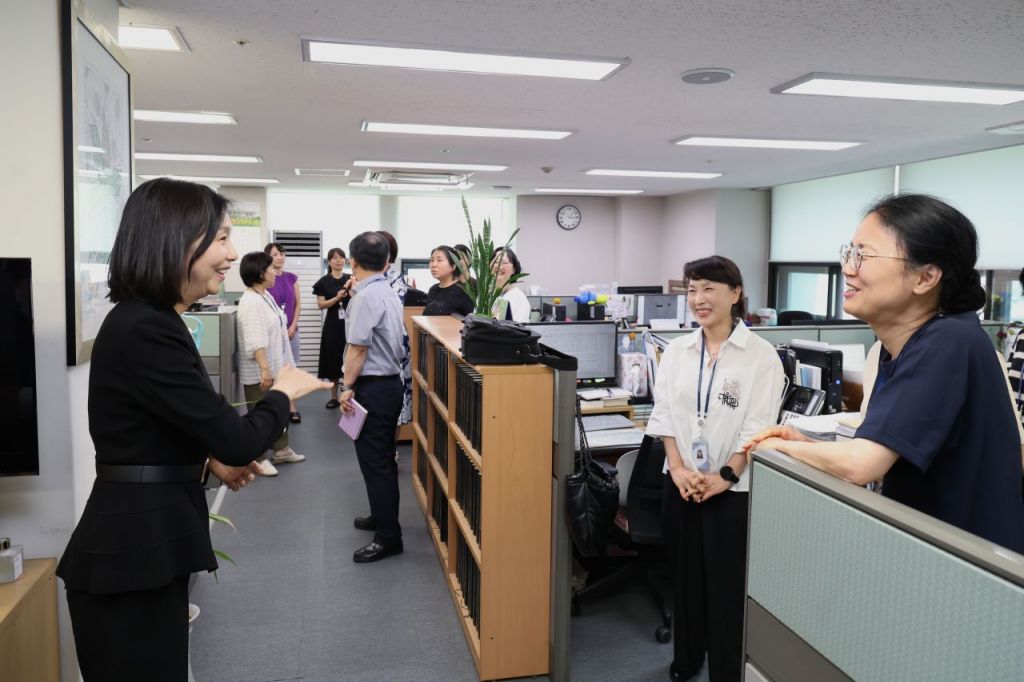 특히 사무환경은 쾌적한지, 개선할 부분은 없는지 꼼꼼히 살피고, 직원 한명 한명 이름을 부르며 다정한 인사를 나눴다.