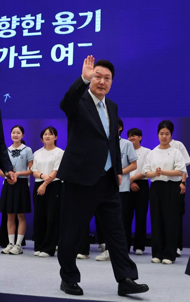 윤석열 대통령이 14일 청와대 영빈관에서 열린 '제1회 북한이탈주민의날 기념식'에서 남한 청소년·북한이탈주민 청소년 합창단과 함께 기념 촬영을 하고 있다. [이미지출처=연합뉴스]