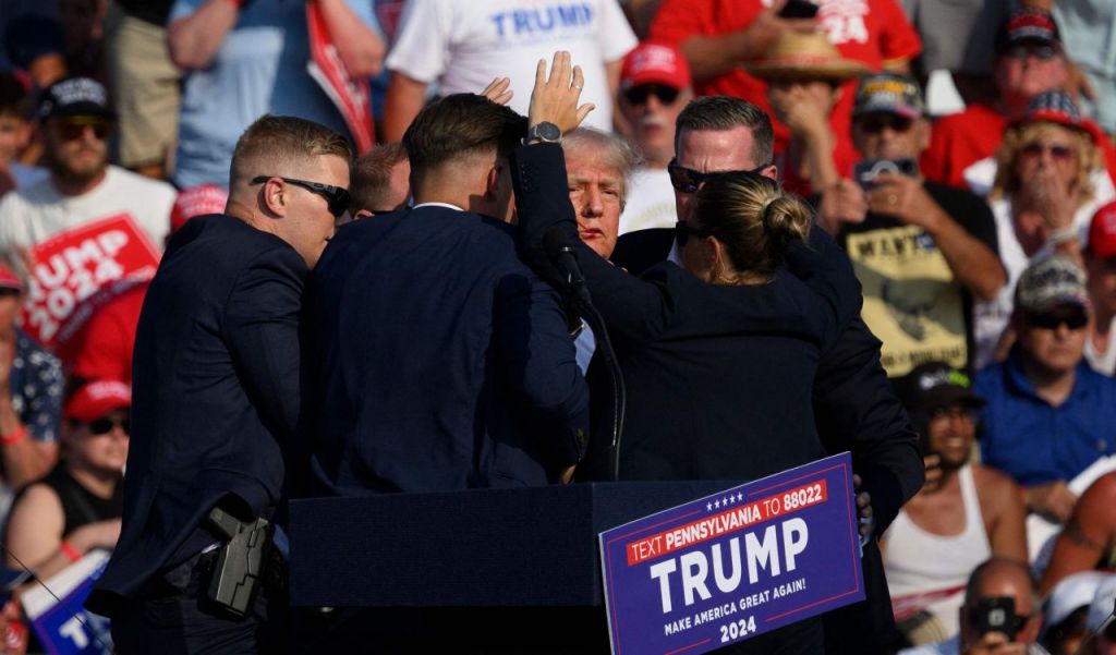 미국 공화당 대선 후보인 도널드 트럼프 전 미국 대통령이 13일(현지시간) 펜실베이니아에서 총격 사건이 벌어진 직후 경호원들로부터 보호 받고 있다 [사진 제공=게티이미지]