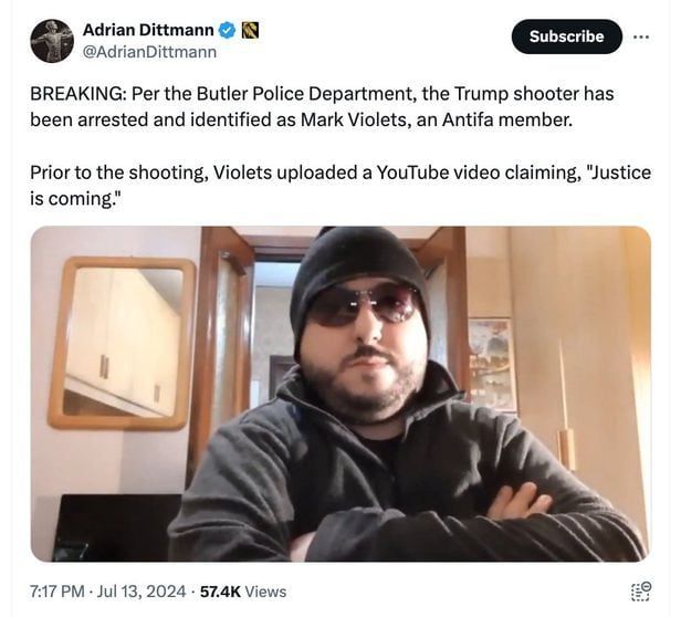 마크 바이올렛의 사진도 온라인에 논란이 됐다. 선글라스와 검은 모자를 쓴 남성이 트럼프 공격 전 유튜브에 “정의가 다가오고 있다”는 영상을 올렸다는 내용이었다. 총격범으로 지목된 남성은 축구 관련 브이로그를 올리는 이탈리아 유튜버 마르코 비올리(Marco Violi)로 알려졌다.