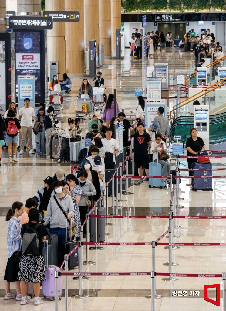 엔화 가치가 역대급으로 하락하면서 일본을 찾는 관광객이 증가하고 있는 서울 김포국제공항을 찾은 여행객들이 짐을 부치기 위해 대기하고 있다. 사진=강진형 기자aymsdream@