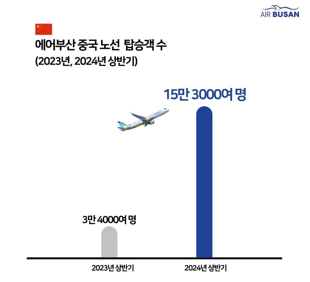 올해 상반기 에어부산의 중국 노선 탑승객이 지난해 동기 대비 약 350% 수준까지 증가하며 회복세를 보인 것으로 나타났다.