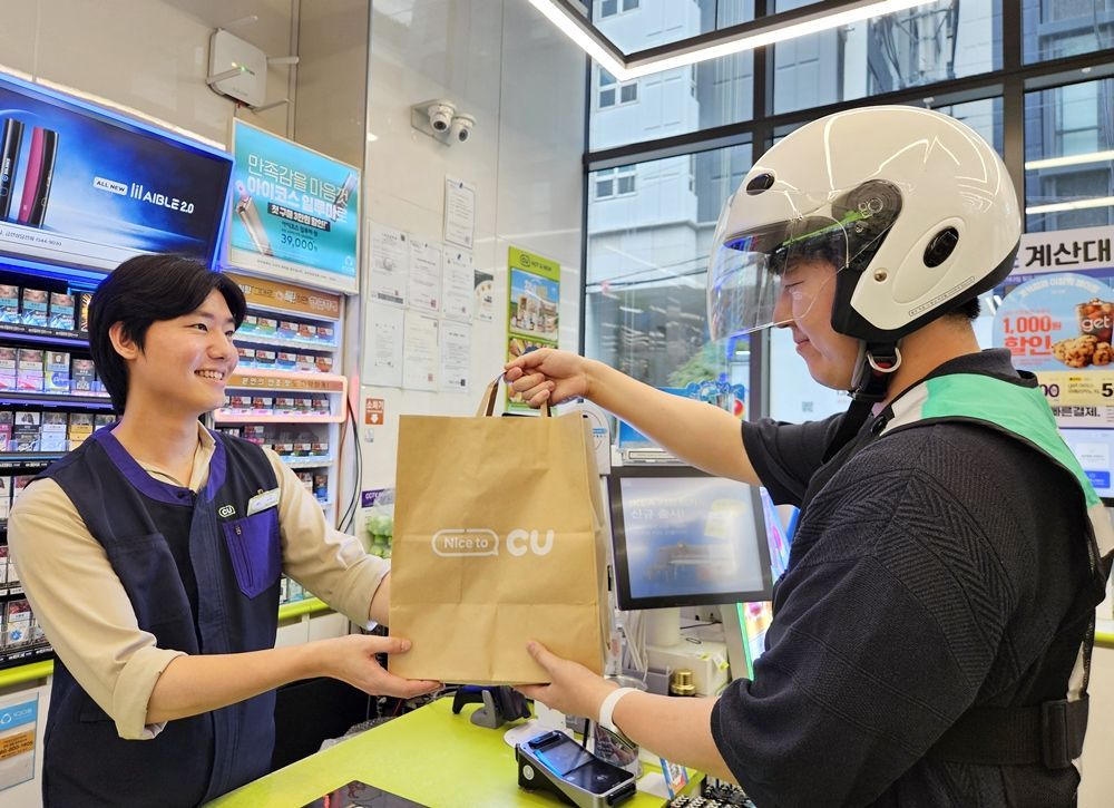 CU 점원이 배달 라이더에게 물품을 전달하고 있다. [사진제공=BGF리테일]