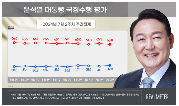 15일 여론조사업체 리얼미터가 공개한 여론조사(에너지경제신문 의뢰로 8~12일, 전국 18세 이상 유권자 2502명 대상으로 무선 97%, 유선 3% 자동응답 방식으로 진행)에 따르면 윤 대통령의 지지율은 지난 주 정례조사와 비교해 1.2%포인트 상승해 32.3%로 조사됐다. 3주만에 지지율이 올랐지만, 윤 대통령 지지율은 총선 이후 14주째 30%대 초반에 머물고 있다. 부정평가는 1.5%포인트 내린 63.8%를 기록했다.