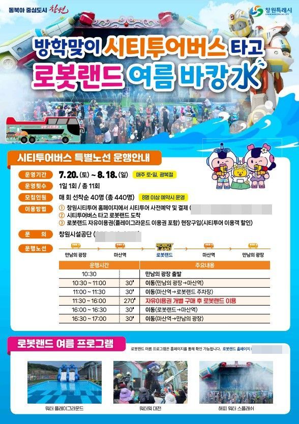 경남 창원특례시는 로봇랜드 여름 이벤트 기간을 맞아 오는 20일부터 8월 18일까지 창원시티투어버스(1층 버스) ‘마산로봇랜드 특별노선’을 운행한다.