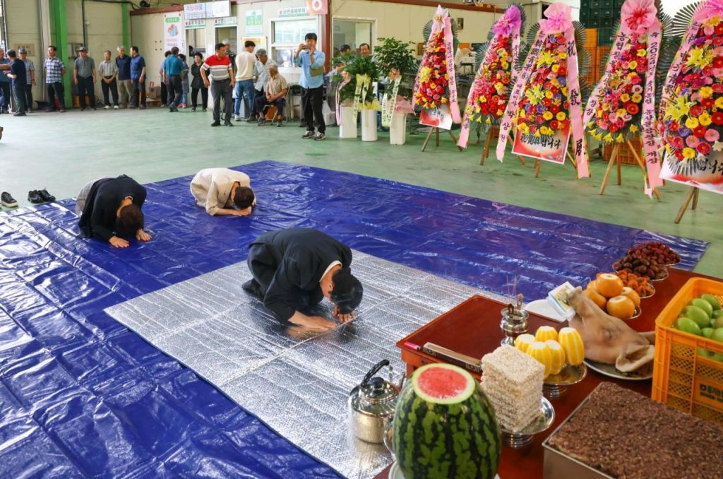 영주시 관계자들이 풍기농협 농산물 공판장 개장식 고사 기원제를 지내고 있다.