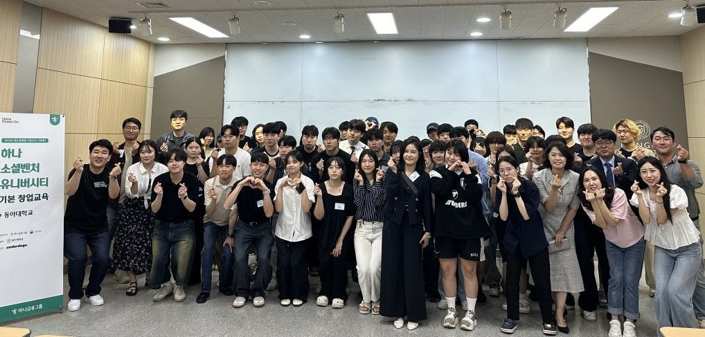 동아대 창업지원단이 2024년 하나 소셜벤처 유니버시티 창업 교육 오리엔테이션을 실시하고 기념촬영 하고 있다.