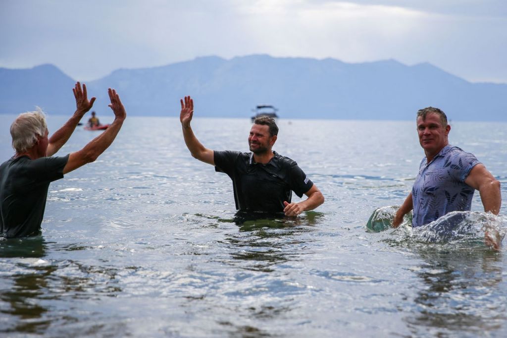 14일(현지시간) 미국 네바다주 스테이트라인의 에지우드 타호 골프코스(파72·6709야드)에서 열린 유명인 골프 대회 아메리칸 센추리 챔피언십(총상금 75만 달러)에서 우승 직후 호수로 뛰어드는 세리머니를 펼치고 있다. 그는 아버지와 하이 파이브를 하면서 우승을 자축했다.
