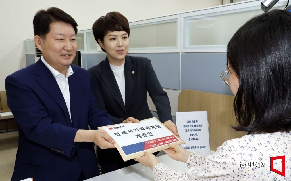 국회 국토교통위원회 여당 간사인 권영진 의원과 김은혜 국민의힘 의원이 15일 국회 의안과에 전세사기특별법 개정안을 제출하고 있다. 사진=김현민 기자 kimhyun81@