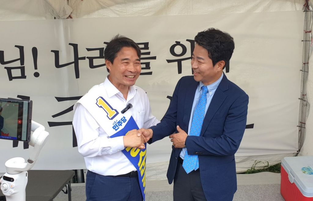 두 후보는 손을 맞잡고 “당원 마음이 편한 도당, 당원이 원하는 도당, 이기는 도당을 만들기 위해 좋은 경쟁을 하겠다”고 말했다.
