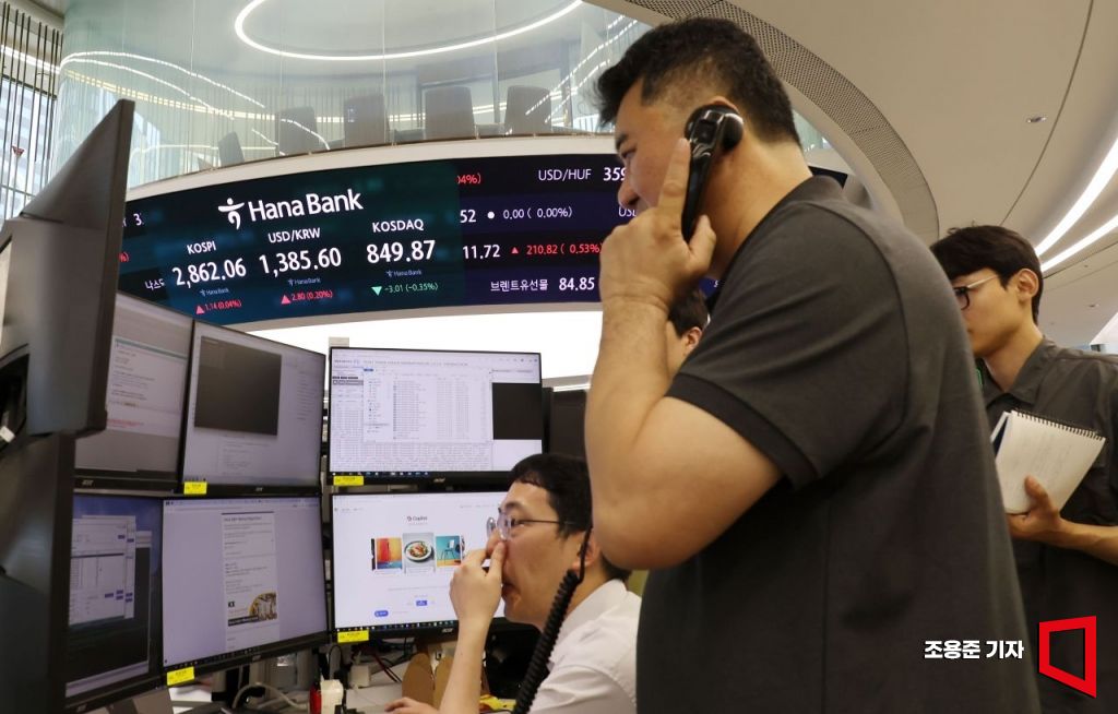 코스피 지수가 전 거래일보다 0.79p(0.03%) 오른 2,861.71, 원/달러 환율은 0.8원 오른 1,384.0원으로 장을 시작한 16일 서울 중구 하나은행 본점 딜링룸에서 딜러들이 업무를 보고 있다. 사진=조용준 기자 jun21@
