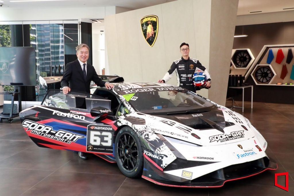 김종복 람보르기니 서울(SQDA 모터스) 대표(왼쪽)가 16일 서울 강남구 람보르기니 서울 센트럴 전시장에서 이창우 그릿모터테인먼트 대표 겸 치프 드라이버와 람보르기니 슈퍼 트로페오 에보2 앞에서 포즈를 취하고 있다. 올해로 11회를 맞이한 람보르기니 슈퍼 트로페오는 유럽, 북미, 아시아 3개 대륙에서 열리는 지구상에서 가장 빠른 레이싱 토너먼트 대회다. 참가 선수들이 람보르기니 슈퍼 트로페오 에보2 단일 모델로 경주를 펼치는 원메이크 레이스다. 사진=람보르기니 서울(SQDA 모터스) 제공