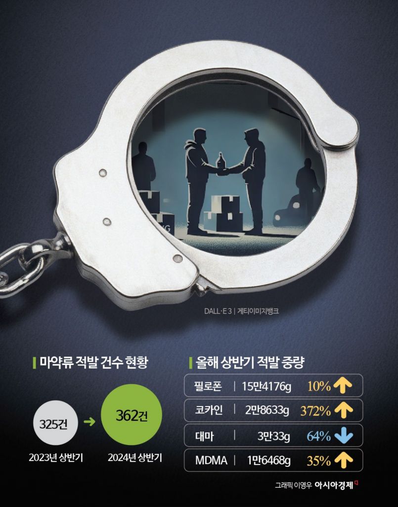 올해 상반기 국경단계서 적발한 마약류의 주요 품목은 ▲필로폰(154㎏·75건) ▲대마(30㎏·100건) ▲코카인(29㎏·4건) ▲MDMA(일명 클럽용 마약, 16㎏·40건) 등이다. 지난해 상반기와 비교했을 때 적발 중량을 기준으로 필로폰은 10%, 코카인은 372%, MDMA는 35% 증가했다. 반면 대마는 64% 감소했다.