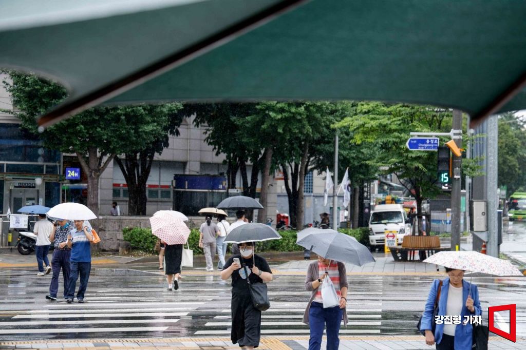 16일 서울 서대문구 충정로에서 시민들이 우산을 쓰고 이동하고 있다.