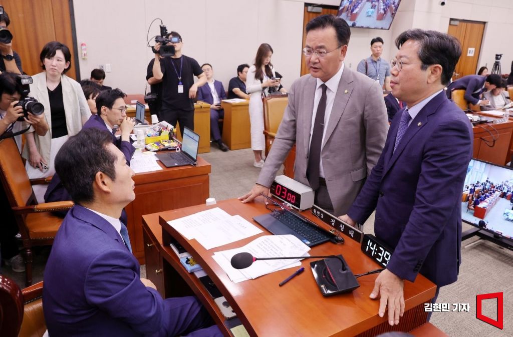 정청래 국회 법제사법위원장이 16일 국회 법사위 전체회의에서 토론 방식을 두고 여당 간사인 유상범 의원, 야당 간사인 김승원 의원과 대화 하고 있다. 사진=김현민 기자 kimhyun81@