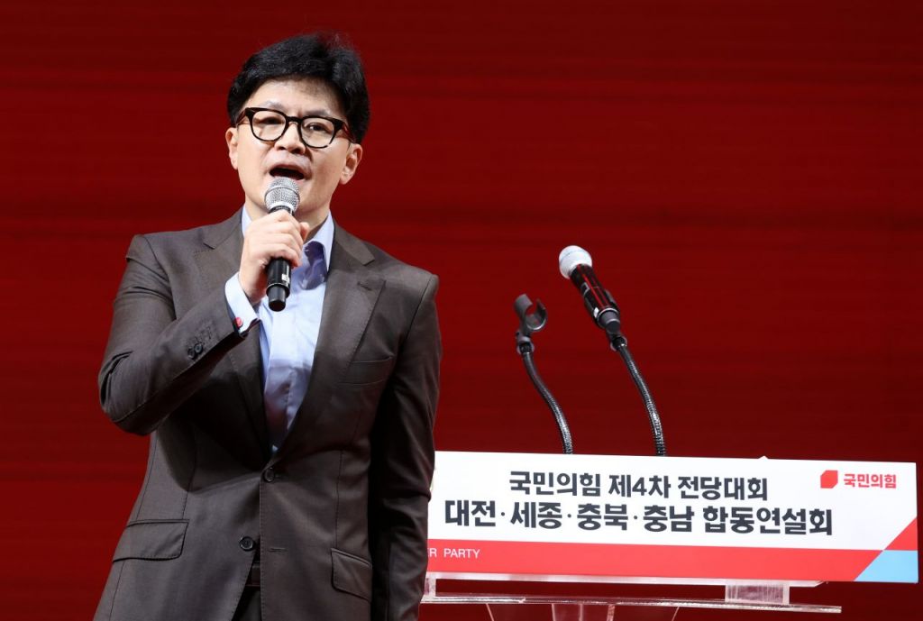 한동훈 국민의힘 당 대표 후보가 15일 오후 충남 천안 유관순체육관에서 열린 대전·세종·충북·충남 합동연설회에서 정견발표를 하고 있다. [이미지출처=연합뉴스]