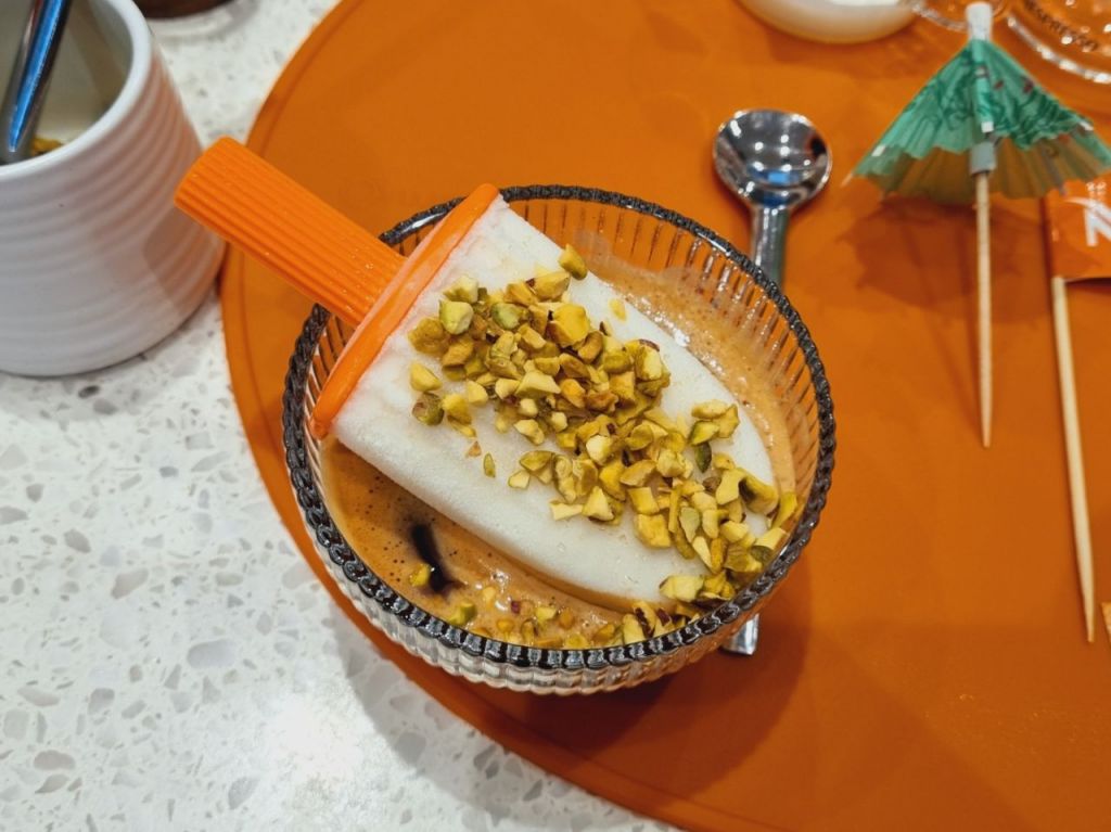 첫 번째로 배운 레시피는 '써니 아포카토'였다. 아이스크림이 담긴 볼에 커피 캡슐 '써니 아몬드 바닐라'로 더블 에스프레소를 추출하고, 그 위에 굵은 입자의 비정제 설탕과 피스타치오를 뿌려주면 완성이다. 이름처럼 아몬드와 바닐라 향이 가미된 커피인 만큼 아이스크림과 함께 먹으니 더욱 부드러운 맛을 냈다.