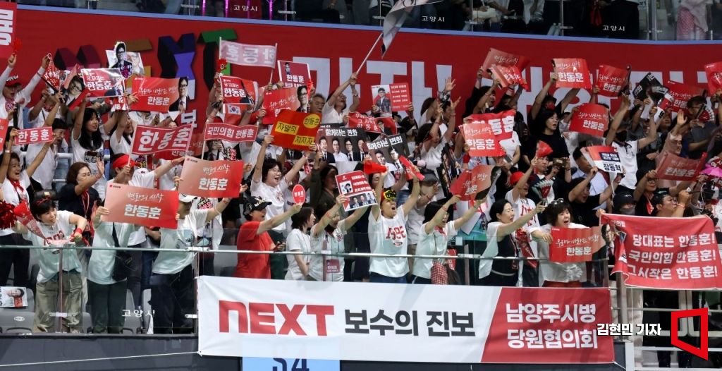 17일 경기 고양시 고양 소노 아레나에서 열린 제4차 전당대회, 서울 인천 경기 강원 합동연설회에서 한동훈 후보의 지지자들이 열띤 응원을 보내고 있다. 사진=김현민 기자 kimhyun81@