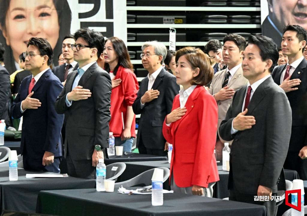 윤상현, 한동훈, 나경원, 원희룡 국민의힘 당대표 후보가 17일 경기 고양 소노 아레나에서 열린 제4차 전당대회, 서울 인천 경기 강원 합동연설회에서 국기에 경례하고 있다. 사진=김현민 기자 kimhyun81@
