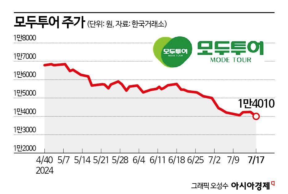 18일 금융투자업계에 따르면 모두투어 주가는 지난 2월14일 연중 최고가를 기록한 이후로 5개월 동안 21% 하락했다. 전날 장중 한때 1만3980원을 기록하면서 연중 최저치를 경신했다. 같은 기간 하나투어는 9% 내렸다. 경쟁사 대비 낙폭이 크다.