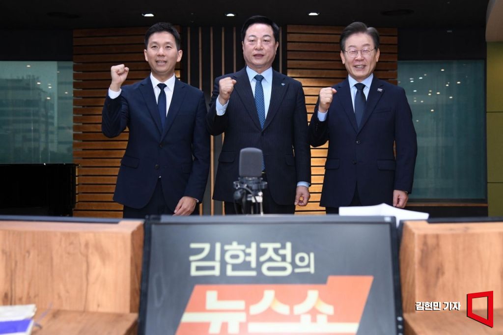 더불어민주당 김지수(왼쪽부터), 김두관, 이재명 당대표 후보가 18일 서울 양천구 CBS 사옥에서 열린 더불어민주당 당대표 후보자 토론회에 앞서 기념 촬영을 하고 있다. 사진=국회사진기자단