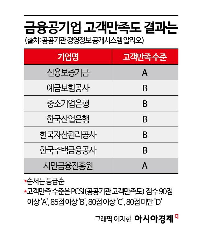 공공기관 경영정보 공개시스템 알리오를 통해 최근 공개된 2023년도 고객만족도 조사 결과를 보면, 신보는 고객만족 수준 A등급을 받았다. 5개 기업(예금보험공사·기업은행·산업은행·한국자산관리공사·한국주택금융공사)은 B등급을, 서민금융진흥원은 C등급을 받았다. 이는 올해 1월 17일부터 3월 15일까지 최근 1년 이내에 금융위원회 산하 7개 금융공기업의 서비스를 직접 경험한 소비자(성인 남녀)를 대상으로 진행됐다.