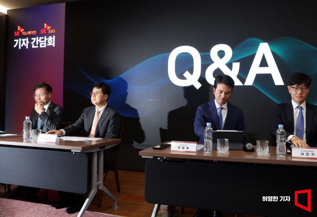 SK이노베이션, SK E&S 합병 기자간담회가 18일 서울 SK 서린빌딩에서 열렸다. 박상규 SK이노베이션 사장(왼쪽 두번째)과 추형욱 SK E&C 사장(세번째) 등이 기자들과의 질의 답변을 위해 자리에 앉아 있다.