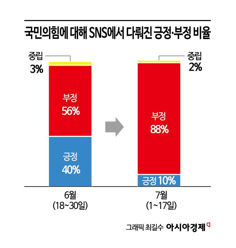 국민의힘의 경우 지난 6월(18~30일)만 해도 SNS에서 긍정적으로 언급되는 비중이 40%(부정적 언급 56%)였다. 하지만 문자메시지 등 각종 악재가 쏟아지면서 7월(1일~17일) 들어 긍정적 언급은 10%(부정적 언급 88%)로 줄어들었다. 대표적으로 언급된 단어만 봐도 지난달에는 ‘최선’, ‘적극적’ 등 긍정적인 단어를 찾아볼 수 있었지만, 이달 들어서는 긍정적 단어는 모두 사라진 채 ‘ 논란’, ‘의혹’, ‘갈등’, ‘범죄’, ‘배신’ 등의 단어로 채워졌다.