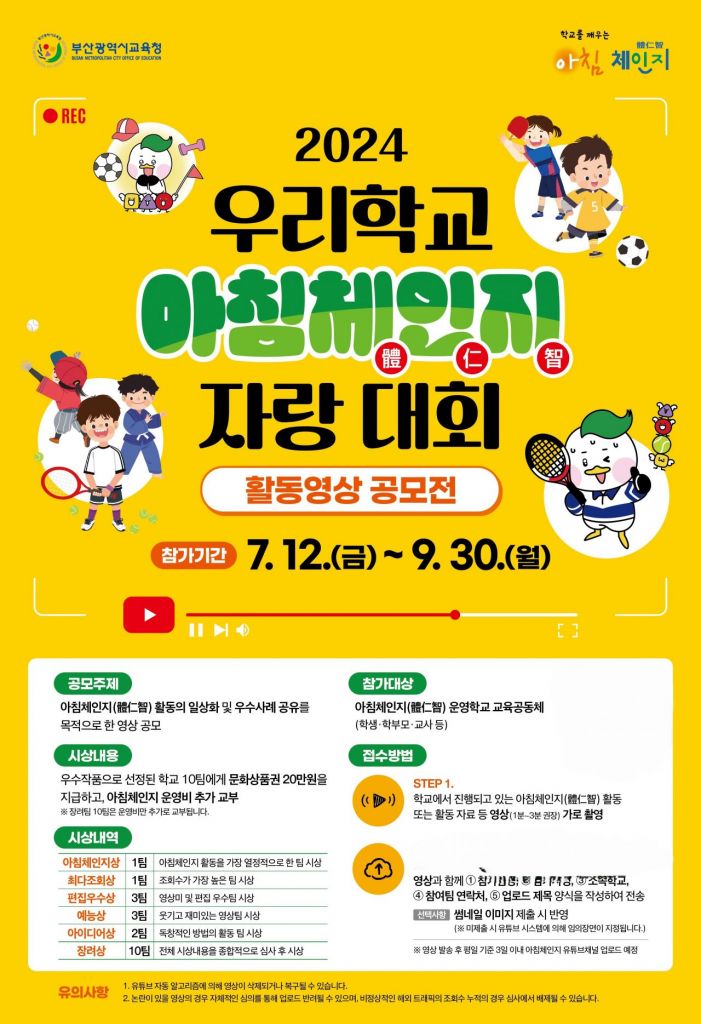부산교육청(교육감 하윤수)은 오는 9월 30일까지 초·중·고·특수학교 대상 ‘우리 학교 아침체인지 자랑대회’를 운영한다고 18일 전했다.