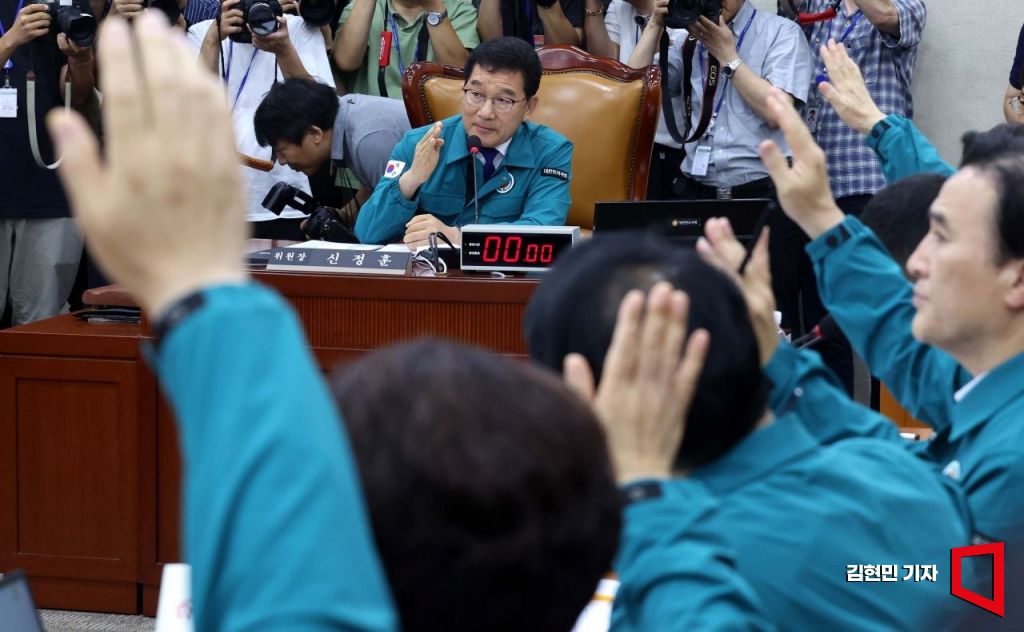18일 국회에서 열린 행정안전위원회 전체회의에서 여당 의원들이 신정훈 의원장의 의사진행 방식에 항의하며 손을 들어 발언권을 요구하고 있다. 이날 회의에서는 이재명 더불어민주당 의원 발의 '2024년 민생위기 극복을 위한 특별조치법안'(전 국민 25만원 지원법)을 처리한다. 사진=김현민 기자 kimhyun81@
