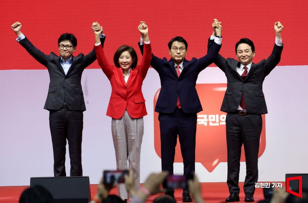 한동훈(왼쪽부터), 나경원, 윤상현, 원희룡 국민의힘 당 대표 후보들이 17일 경기 고양시 고양 소노 아레나에서 열린 제4차 전당대회, 서울 인천 경기 강원 합동연설회에서 손을 들어 인사하고 있다. 사진=김현민 기자 kimhyun81@