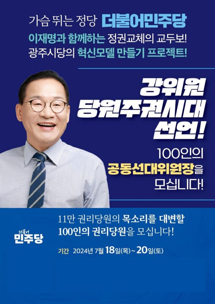 ‘365일 열린 시당’과 ‘당원주권시대 혁신’을 강조하며 더불어민주당 광주광역시당 위원장에 도전장을 던진 강위원 더민주전국혁신회의 상임대표가 ‘혁신돌풍 선대위’를 구성한다.