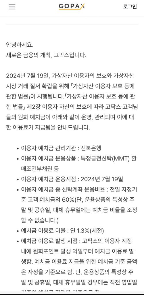 고팍스가 5대 가상자산 거래소 중 최초로 이용자 예치금 이용료율을 공개했다. 사진=고팍스 공지사항 캡쳐