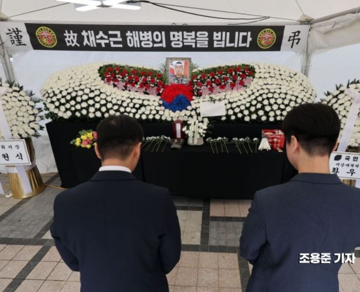 19일 서울 중구 청계광장에 마련된 고(故) 채상병 1주기 추모 시민분향소를 찾은 시민들이 헌화, 조문하고 있다. 사진=조용준 기자 jun21@