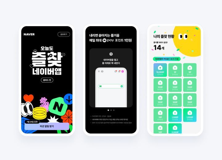 오늘도 즐찾 네이버앱은 사용자가 네이버 앱을 찾고 네이버앱에서 즐거움을 발견할 수 있다는 의미를 담은 이벤트다.