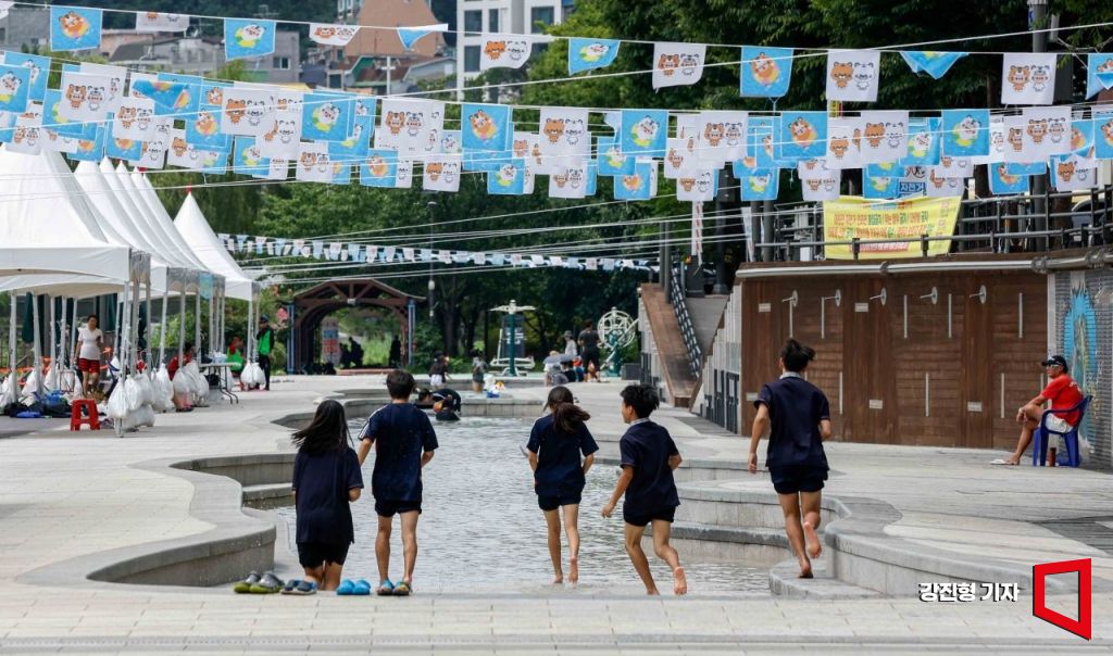 중부지방에 장맛비가 주춤해지며 다시 찜통더위가 찾아온 19일 서울 송파구 성내천 물놀이장을 찾은 시민들이 물놀이를 하며 더위를 식히고 있다.