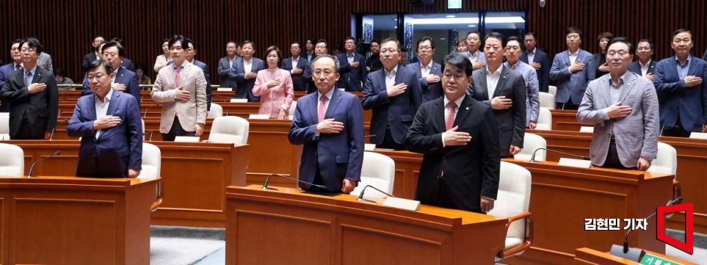 추경호 국민의힘 원내대표를 비롯한 여당 의원들이 19일 국회에서 열린 의원총회에서 국민의례를 하고 있다. 사진=김현민 기자 kimhyun81@